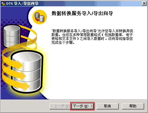 2. 进入DTS导入/导出向导,点击“下一步”按钮继续
